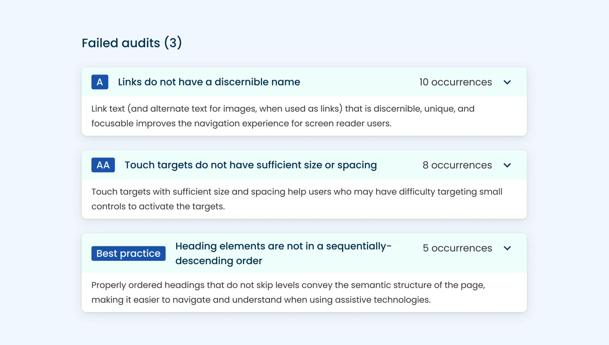 - Missing alt text - A lack of alternative text for images (alt tags), that can be read out by screen readers for visually impaired users.