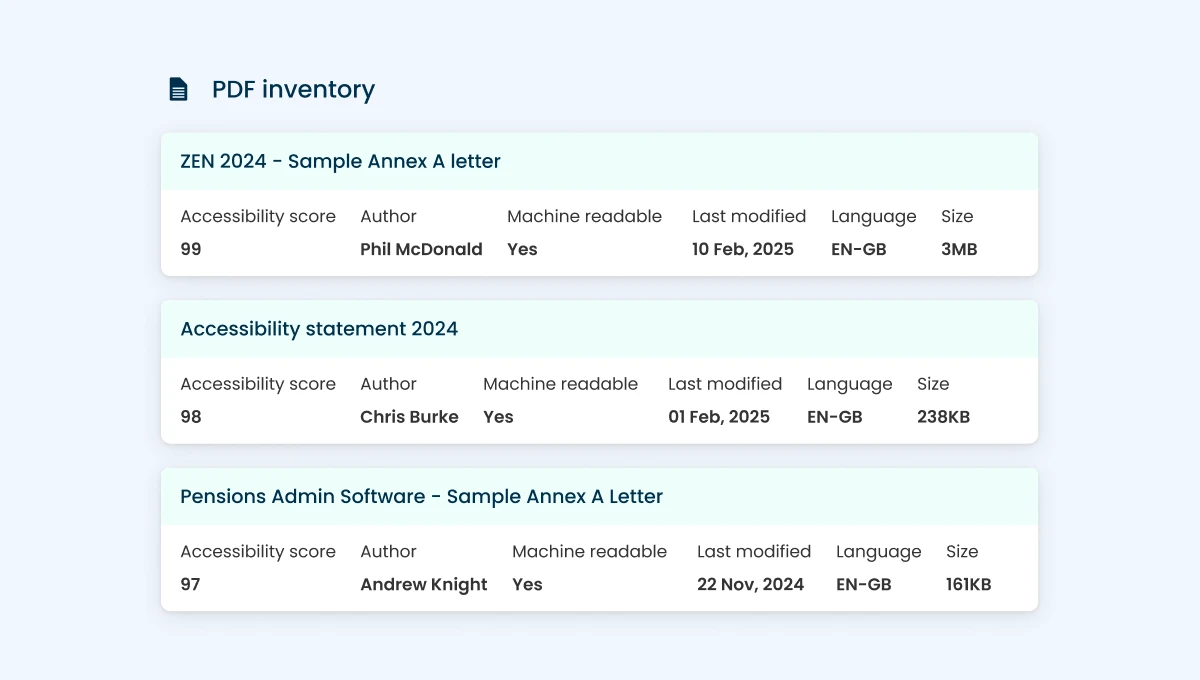 Tools such as Insytful scan for missing metadata, inaccessible reading orders, a lack of alternative text, and other PDF-specific barriers. Insytful's PDF and document inventory lists all the PDFs listed on your site plus other useful metrics like their size and metadata.