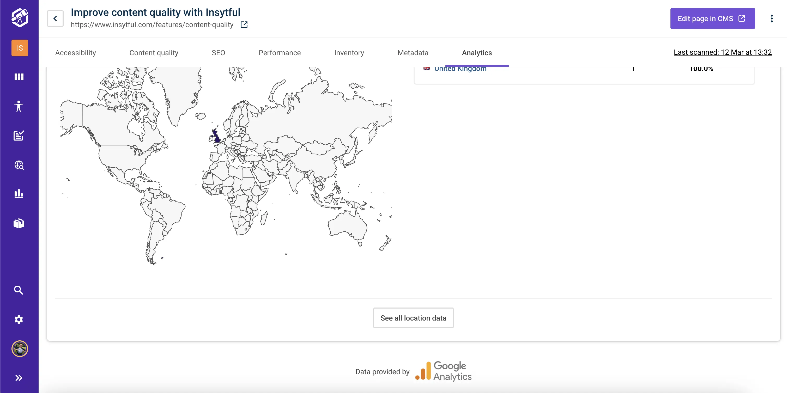 Currently, the integration allows you to see page views and location information for page visitors within the Insytful UI. As we continue to iterate, more data will be visible in the app.