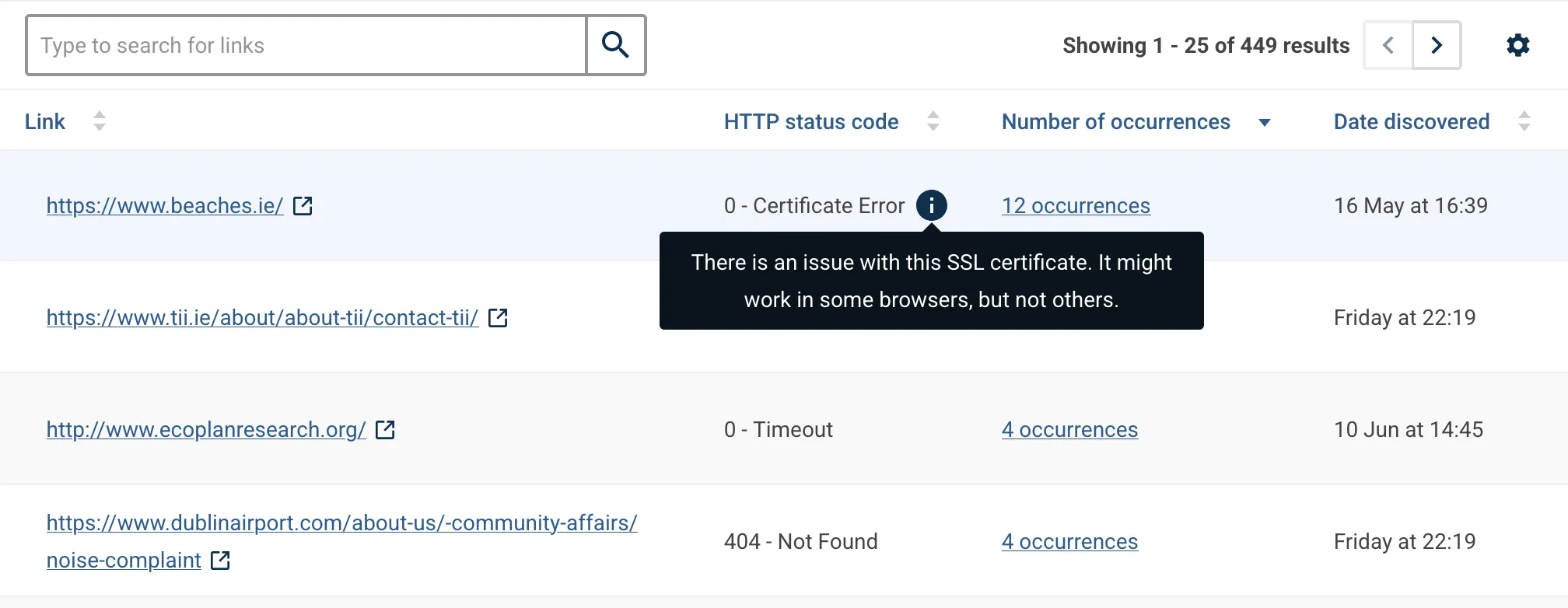 In our latest release, we can now differentiate between broken links and SSL certificate errors. We have introduced a new tooltip to inform users, as shown below.